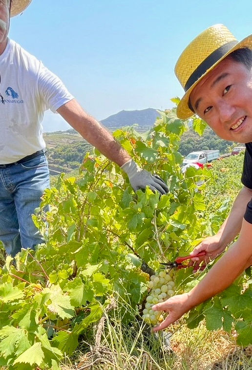 なかでも食後酒としてお出ししているベン・リエは、パンテレリーア島で完熟したジビッボ種を天然乾燥させ、糖分と芳香成分を極限まで凝縮させた芳醇なパッシートワイン。実は私自身、パンテレリーア島を訪れ、ベン・リエ用のブドウの収穫にも参加させていただいたことがあります。